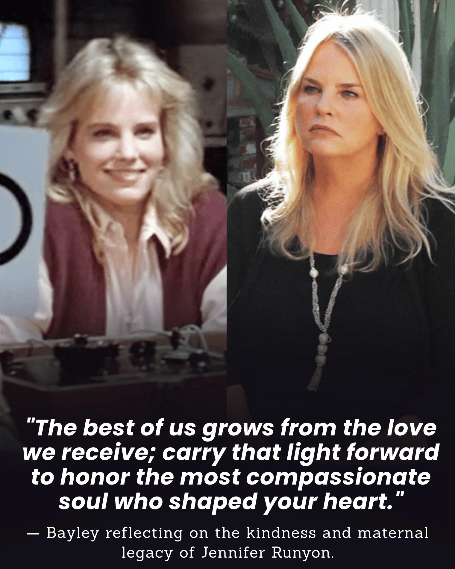 Jennifer Runyon's legacy therefore extends far beyond the film sets and television studios where she once worked. It lives in the memories of audiences who grew up watching her performances, and more deeply in the lives of the people she loved. Bayley's reflection reminds us that while careers may fade and fame may shift with time, the kindness a person gives to others continues to shine long after they are gone. In carrying that light forward, those who loved Runyon ensure that her compassion will remain part of the world she left behind.